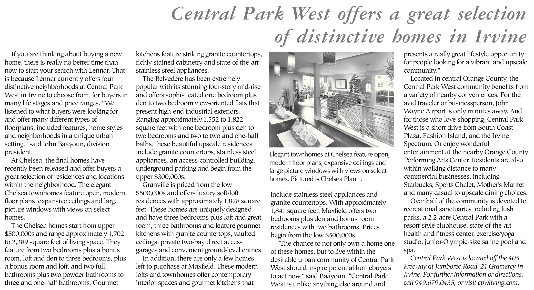 Central Park West is located off the 405 Freeway at Jamboree Road, 21 Gramercy in Irvine. For further information or directions, call 949.679.0435, or visit cpwliving.com.