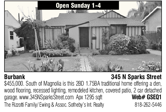 Open Sunday 1-4 Burbank 345 N Sparks Street $455,000. South of Magnolia is this 2BD 1.75BA traditional home offering a den, wood flooring, recessed lighting, remodeled kitchen, covered patio, 2 car detached garage. www.345NSparksStreet.com Apx 1295 sqft Web# GSEQ1 The Rizzotti Family/ Ewing & Assoc. Sotheby’s Int. Realty 818-262-5446