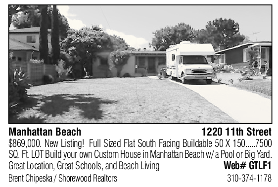 Manhattan Beach 1220 11th Street $869,000. New Listing! Full Sized Flat South Facing Buildable 50 X 150.....7500 SQ. Ft. LOT Build your own Custom House in Manhattan Beach w/ a Pool or Big Yard. Great Location, Great Schools, and Beach Living Web# GTLF1 Brent Chipeska / Shorewood Realtors 310-374-1178
