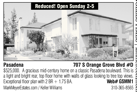 Reduced! Open Sunday 2-5 Pasadena 707 S Orange Grove Blvd #D $525,000. A gracious mid-century home on a classic Pasadena boulevard. This is a light and bright rear, top floor home with walls of glass looking to tree top views. Exceptional floor plan with 2 BR + 1.75 BA. Web# GSMM1 MarkMeyerEstates.com / Keller Williams 310-365-8565
