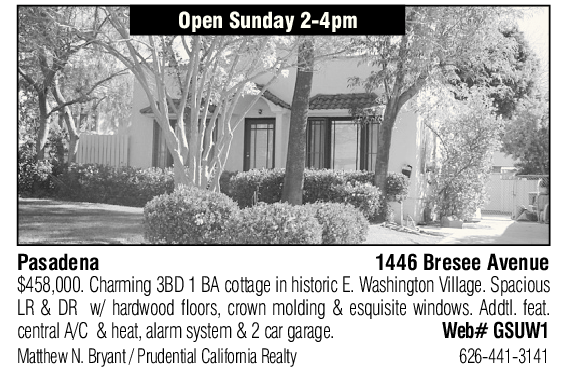 Open Sunday 2-4pm Pasadena 1446 Bresee Avenue $458,000. Charming 3BD 1 BA cottage in historic E. Washington Village. Spacious LR & DR w/ hardwood floors, crown molding & esquisite windows. Addtl. feat. central A/C & heat, alarm system & 2 car garage. Web# GSUW1 Matthew N. Bryant / Prudential California Realty 626-441-3141