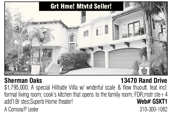 Grt Hme! Mtvtd Seller! Sherman Oaks 13470 Rand Drive $1,795,000. A special Hillside Villa w/ wnderful scale & flow thuoutt. feat incl: formal living room; cook’s kitchen that opens to the family room; FDR;mstr ste+4 add’l Br stes;Superb Home theater! Web# GSKT1 A Comora/P Lester 310-300-1082