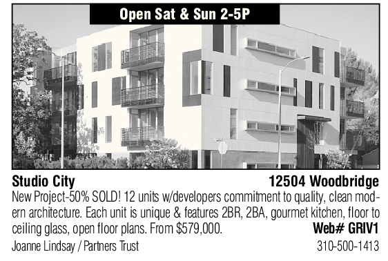 Open Sat & Sun 2-5P Studio City 12504 Woodbridge New Project-50% SOLD! 12 units w/developers commitment to quality, clean modern architecture. Each unit is unique & features 2BR, 2BA, gourmet kitchen, floor to ceiling glass, open floor plans. From $579,000. Web# GRIV1 Joanne Lindsay / Partners Trust 310-500-1413