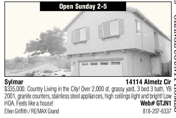 Open Sunday 2-5 Sylmar 14114 Almetz Cir 2001, granite counters, stainless steel appliances, high ceilings light and bright! Low $335,000. Country Living in the City! Over 2,000 sf, grassy yard, 3 bed 3 bath, YB HOA. Feels like a house! Web# GTJN1 Ellen Griffith / RE/MAX Grand 818-207-6337 See also