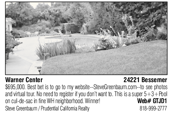 Warner Center 24221 Bessemer $695,000. Best bet is to go to my website--SteveGreenbaum.com--to see photos and virtual tour. No need to register if you don’t want to. This is a super 5+3+Pool on cul-de-sac in fine WH neighborhood. Winner! Web# GTJD1 Steve Greenbaum / Prudential California Realty 818-999-2777