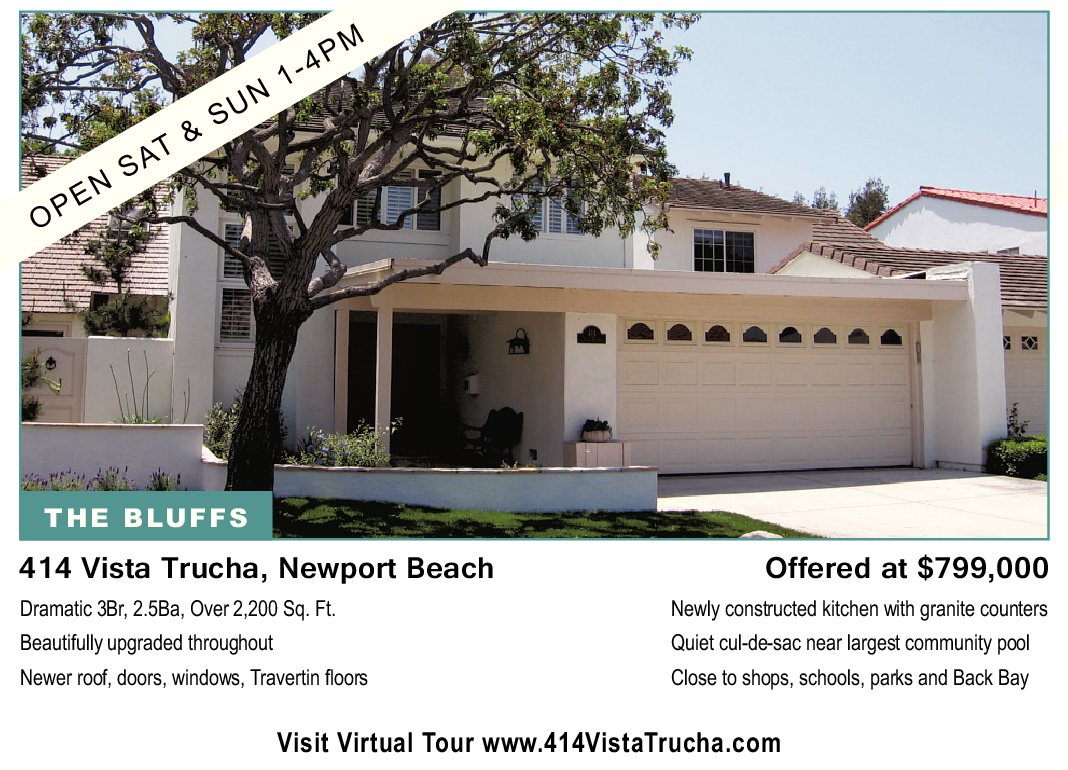 THE BLUFFS 414 Vista Trucha, Newport Beach Offered at $799,000 Dramatic 3Br, 2.5Ba, Over 2,200 Sq. Ft. Beautifully upgraded throughout Newer roof, doors, windows, Travertin floors Visit Virtual Tour www.414VistaTrucha.com Newly constructed kitchen with granite counters Quiet cul-de-sac near largest community pool Close to shops, schools, parks and Back Bay