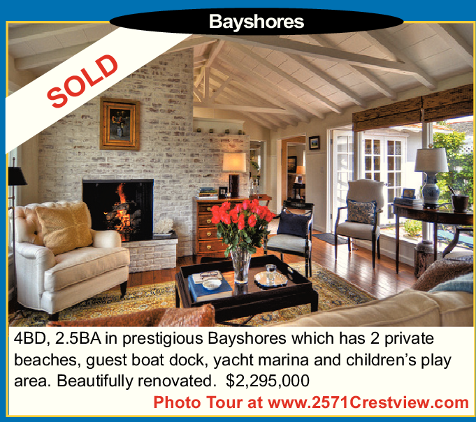 4BD, 2.5BA in prestigious Bayshores which has 2 private beaches, guest boat dock, yacht marina and children’s play area. Beautifully renovated. $2,295,000 Photo Tour at www.2571Crestview.com