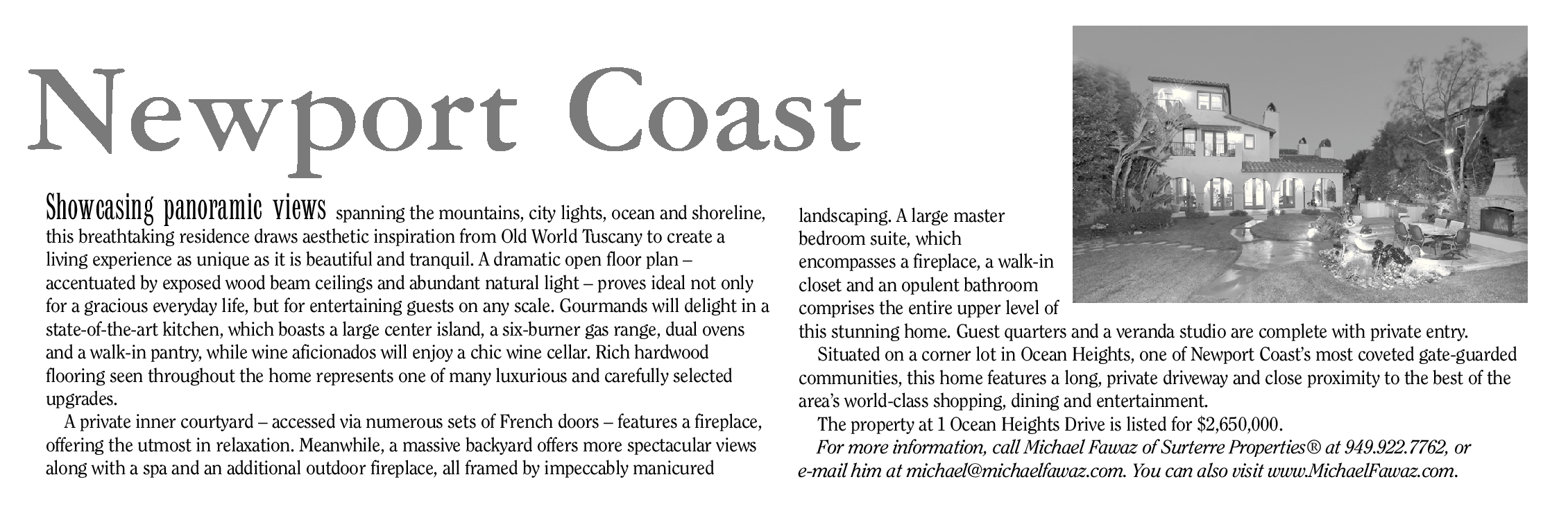 The property at 1 Ocean Heights Drive is listed for $2,650,000. For more information, call Michael Fawaz of Surterre Properties® at 949.922.7762, or e-mail him at michael@michaelfawaz.com. You can also visit www.MichaelFawaz.com.