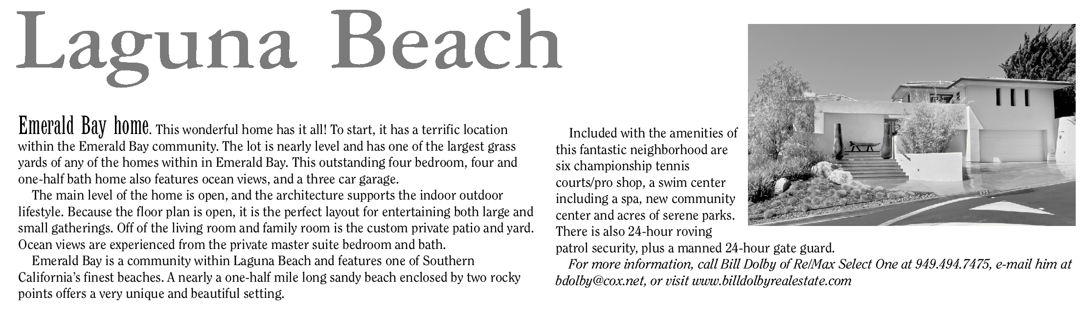 For more information, call Bill Dolby of Re/Max Select One at 949.494.7475, e-mail him at bdolby@cox.net, or visit www.billdolbyrealestate.com
