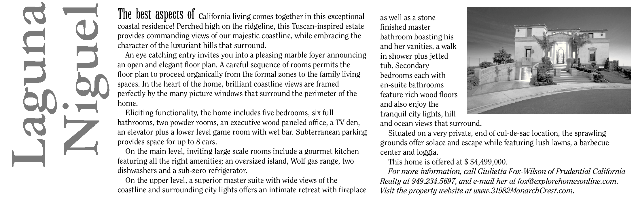 This home is offered at $ $4,499,000. For more information, call Giulietta Fox-Wilson of Prudential California Realty at 949.234.5697, and e-mail her at fox@explorehomesonline.com. Visit the property website at www.31982MonarchCrest.com.