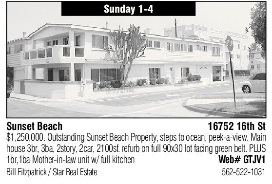 Sunset Beach 16752 16th St $1,250,000. Outstanding Sunset Beach Property, steps to ocean, peek-a-view. Main house 3br, 3ba, 2story, 2car, 2100sf. refurb on full 90x30 lot facing green belt. PLUS 1br,1ba Mother-in-law unit w/ full kitchen Web# GTJV1 Bill Fitzpatrick / Star Real Estate 562-522-1031