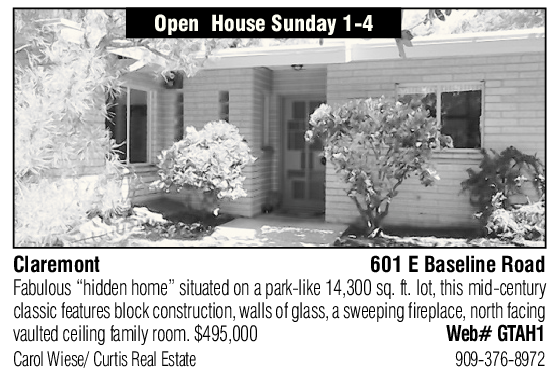 Claremont 601 E Baseline Road Fabulous “hidden home” situated on a park-like 14,300 sq. ft. lot, this mid-century classic features block construction, walls of glass, a sweeping fireplace, north facing vaulted ceiling family room. $495,000 Web# GTAH1 Carol Wiese/ Curtis Real Estate 909-376-8972