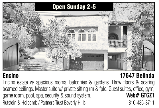 Encino 17647 Belinda Encino estate w/ spacious rooms, balconies & gardens. Hrdw floors & soaring beamed ceilings. Master suite w/ private sitting rm & fplc. Guest suites, office, gym, game room, pool, spa, security & sound system. Web# GTGZ1 Rutstein & Holcomb / Partners Trust Beverly Hills 310-435-3711