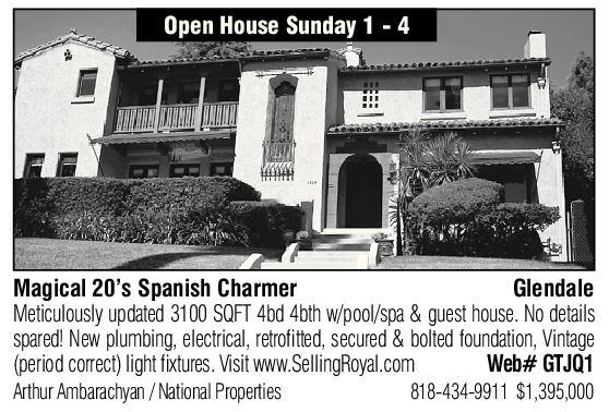 Magical 20’s Spanish Charmer Glendale Meticulously updated 3100 SQFT 4bd 4bth w/pool/spa & guest house. No details spared! New plumbing, electrical, retrofitted, secured & bolted foundation, Vintage (period correct) light fixtures. Visit www.SellingRoyal.com Web# GTJQ1 Arthur Ambarachyan / National Properties 818-434-9911 $1,395,000