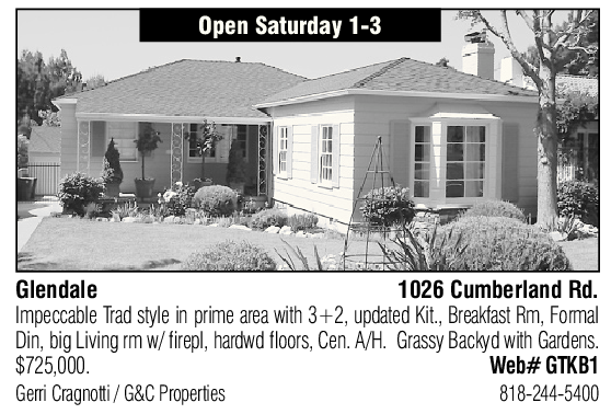 Open Saturday 1-3 Glendale 1026 Cumberland Rd. Impeccable Trad style in prime area with 3+2, updated Kit., Breakfast Rm, Formal Din, big Living rm w/ firepl, hardwd floors, Cen. A/H. Grassy Backyd with Gardens. $725,000. Web# GTKB1 Gerri Cragnotti / G&C Properties 818-244-5400