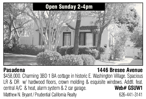 Open Sunday 2-4pm Pasadena 1446 Bresee Avenue $458,000. Charming 3BD 1 BA cottage in historic E. Washington Village. Spacious LR & DR w/ hardwood floors, crown molding & esquisite windows. Addtl. feat. central A/C & heat, alarm system & 2 car garage. Web# GSUW1 Matthew N. Bryant / Prudential California Realty 626-441-3141