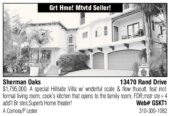 Sherman Oaks 13470 Rand Drive $1,795,000. A special Hillside Villa w/ wnderful scale & flow thuoutt. feat incl: formal living room; cook’s kitchen that opens to the family room; FDR;mstr ste+4 add’l Br stes;Superb Home theater! Web# GSKT1 A Comora/P Lester 310-300-1082