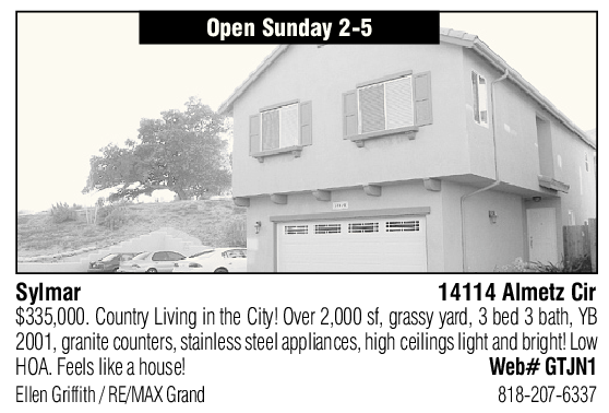Sylmar 14114 Almetz Cir 2001, granite counters, stainless steel appliances, high ceilings light and bright! Low $335,000. Country Living in the City! Over 2,000 sf, grassy yard, 3 bed 3 bath, YB HOA. Feels like a house! Web# GTJN1 Ellen Griffith / RE/MAX Grand 818-207-6337