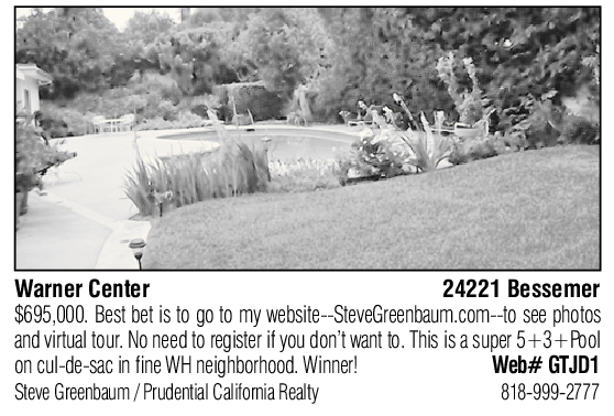 Warner Center 24221 Bessemer $695,000. Best bet is to go to my website--SteveGreenbaum.com--to see photos and virtual tour. No need to register if you don’t want to. This is a super 5+3+Pool on cul-de-sac in fine WH neighborhood. Winner! Web# GTJD1 Steve Greenbaum / Prudential California Realty 818-999-2777