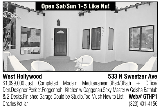West Hollywood 533 N Sweetzer Ave $1,099,000.Just Completed Modern Mediterranean.3Bed/3Bath + Office/ Den.Designer Perfect.Poggenpohl Kitchen w Gaggenau.Sexy Master w Geisha Bathtub & 2 Decks.Finished Garage Could be Studio.Too Much New to List! Web# GTHP1 Charles Kotliar (323) 401-4156