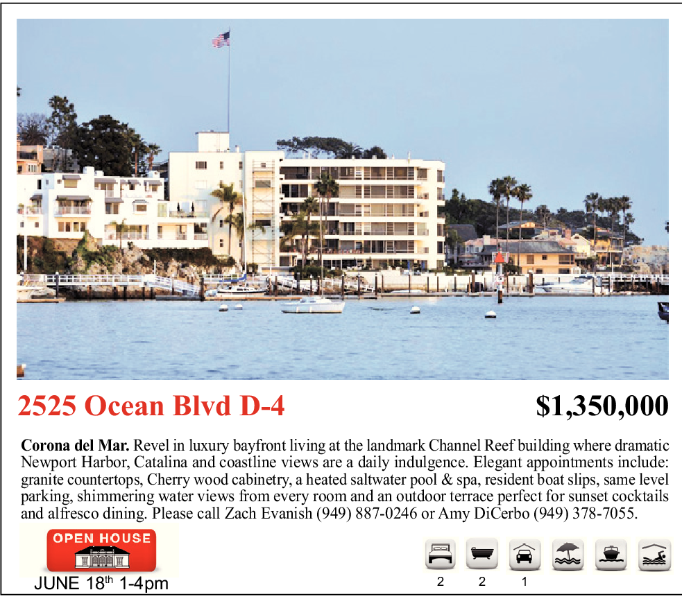 Corona del Mar. Revel in luxury bayfront living at the landmark Channel Reef building where dramatic Newport Harbor, Catalina and coastline views are a daily indulgence. Elegant appointments include: granite countertops, Cherry wood cabinetry, a heated saltwater pool & spa, resident boat slips, same level parking, shimmering water views from every room and an outdoor terrace perfect for sunset cocktails and alfresco dining. Please call Zach Evanish (949) 887-0246 or Amy DiCerbo (949) 378-7055.