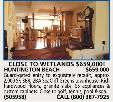 CLOSE TO WETLANDS $659,000! HUNTINGTON BEACH $659,000 Guard-gated entry to exquisitely rebuilt, approx. 2,000 SF, 3BR, 2BA SeaCliff Greens townhouse. Rich hardwood floors, granite slabs, SS appliances & custom cabinets. Close to golf, tennis, pool & spa. (505958) CALL (800) 387-7925