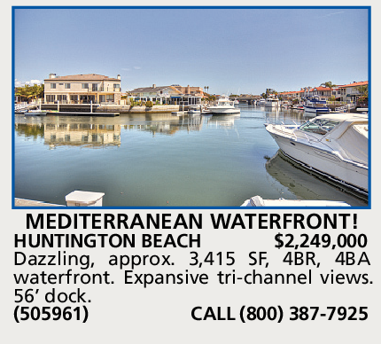 HUNTINGTON BEACH $2,249,000 Dazzling, approx. 3,415 SF, 4BR, 4BA waterfront. Expansive tri-channel views. 56’ dock. (505961) CALL (800) 387-7925
