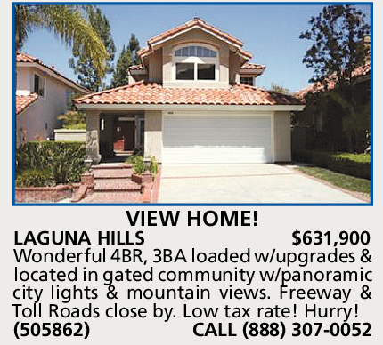 LAGUNA HILLS $631,900 Wonderful 4BR, 3BA loaded w/upgrades & located in gated community w/panoramic city lights & mountain views. Freeway & Toll Roads close by. Low tax rate! Hurry!
