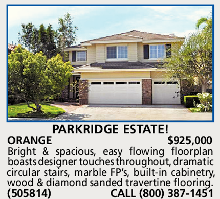 ORANGE $925,000 Bright & spacious, easy flowing floorplan boasts designer touches throughout, dramatic circular stairs, marble FP’s, built-in cabinetry, wood & diamond sanded travertine flooring. (505814) CALL (800) 387-1451