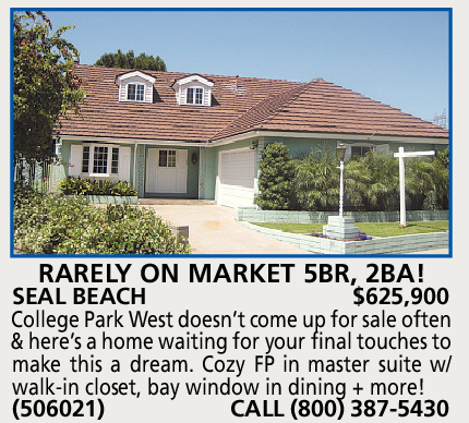 RARELY ON MARKET 5BR, 2BA! SEAL BEACH $625,900 College Park West doesn’t come up for sale often & here’s a home waiting for your final touches to make this a dream. Cozy FP in master suite w/ walk-in closet, bay window in dining + more! (506021) CALL (800) 387-5430