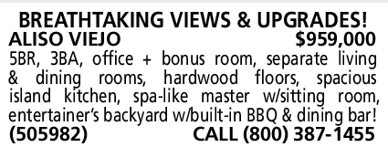 BREATHTAKING VIEWS & UPGRADES! ALISO VIEJO $959,000 5BR, 3BA, office + bonus room, separate living & dining rooms, hardwood floors, spacious island kitchen, spa-like master w/sitting room, entertainer’s backyard w/built-in BBQ & dining bar! (505982) CALL (800) 387-1455