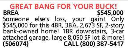 BREA $545,000 Someone else’s loss, your gain! Only $545,000 for this 4BR, 3BA, 2,673 SF, 2-story bank-owned home! 1BR downstairs, 3-car attached garage, large 8,050 SF lot & more! (506074) CALL (800) 387-5417