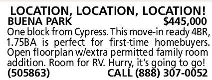 LOCATION, LOCATION, LOCATION! BUENA PARK $445,000 One block from Cypress. This move-in ready 4BR, 1.75BA is perfect for first-time homebuyers. Open floorplan w/extra permitted family room addition. Room for RV. Hurry, it’s going to go! (505863) CALL (888) 307-0052