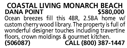 COASTAL LIVING MONARCH BEACH DANA POINT $580,000 Ocean breezes fill this 4BR, 2.5BA home w/ custom cherry wood library. The property is full of wonderful designer touches including travertine floors, crown moldings & gourmet kitchen. (506087) CALL (800) 387-1447