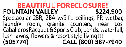 BEAUTIFUL FORECLOSURE! FOUNTAIN VALLEY $224,900 Spectacular 2BR, 2BA w/9-ft. ceilings, FP, wetbar, laundry room, granite counters, near Los Caballeros Racquet & Sports Club, ponds, waterfall, lush lawns, flowers & resort-style living!!! (505774) CALL (800) 387-7940