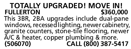 FULLERTON $360,000 This 3BR, 2BA upgrades include dual-pane windows, recessed lighting, newer cabinetry, granite counters, stone-tile flooring, newer A/C & heater, copper plumbing & more. (506070) CALL (800) 387-5417