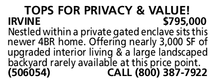 TOPS FOR PRIVACY & VALUE! IRVINE $795,000 Nestled within a private gated enclave sits this newer 4BR home. Offering nearly 3,000 SF of upgraded interior living & a large landscaped backyard rarely available at this price point. (506054) CALL (800) 387-7922