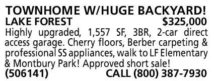 TOWNHOME W/HUGE BACKYARD! LAKE FOREST $325,000 Highly upgraded, 1,557 SF, 3BR, 2-car direct access garage. Cherry floors, Berber carpeting & professional SS appliances, walk to LF Elementary & Montbury Park! Approved short sale! (506141) CALL (800) 387-7930