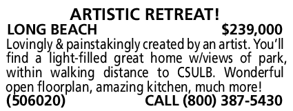 ARTISTIC RETREAT! LONG BEACH $239,000 Lovingly & painstakingly created by an artist. You’ll find a light-filled great home w/views of park, within walking distance to CSULB. Wonderful open floorplan, amazing kitchen, much more! (506020) CALL (800) 387-5430