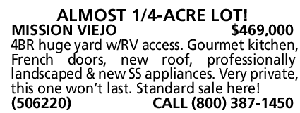 MISSION VIEJO $469,000 4BR huge yard w/RV access. Gourmet kitchen, French doors, new roof, professionally landscaped & new SS appliances. Very private, this one won’t last. Standard sale here! (506220) CALL (800) 387-1450