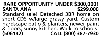 SANTA ANA $299,000 Standard sale! Detached 3BR home on short CDS w/large grassy yard. Custom hardscape patio & planters, newer paint & floors, sunny kitchen. Walk to schools!