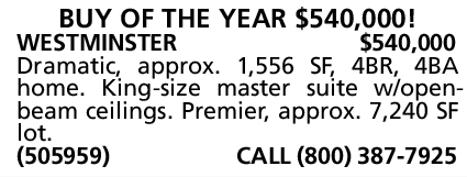 WESTMINSTER $540,000 Dramatic, approx. 1,556 SF, 4BR, 4BA home. King-size master suite w/openbeam ceilings. Premier, approx. 7,240 SF lot. (505959) CALL (800) 387-7925