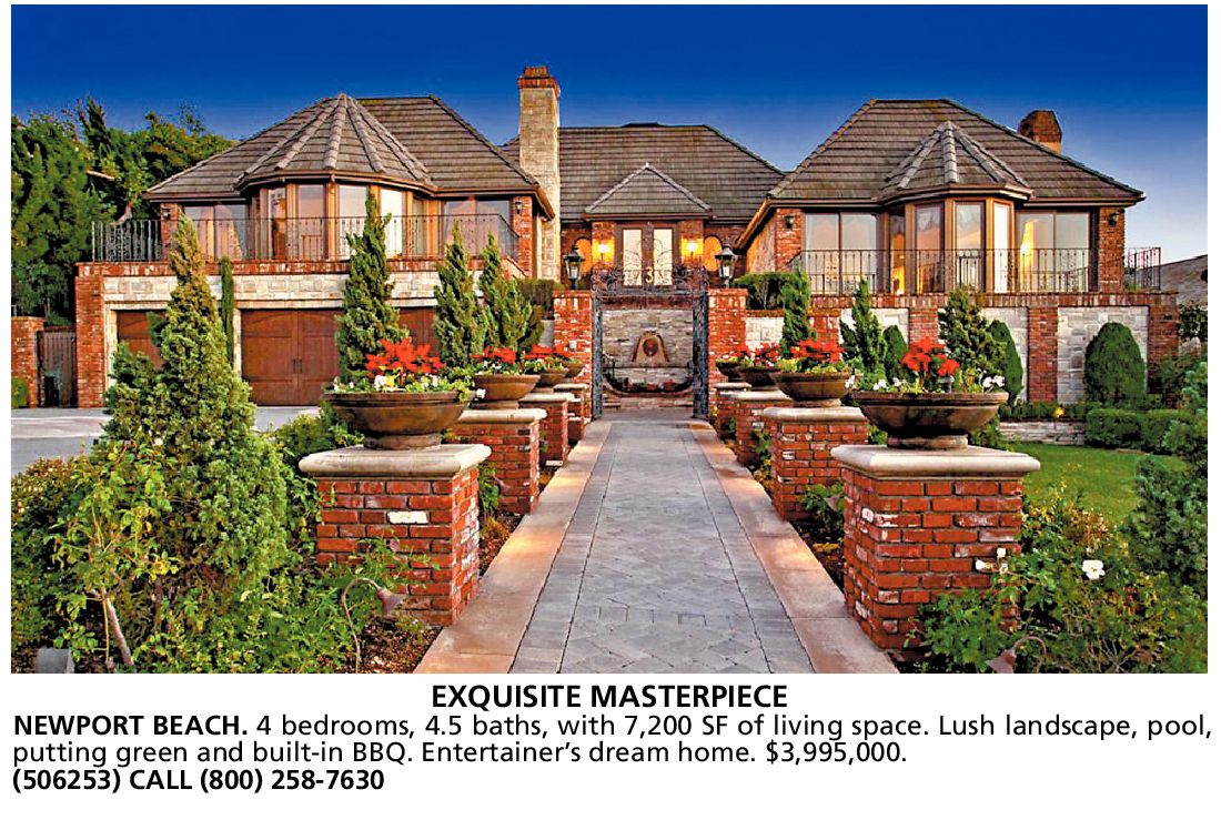 EXQUISITE MASTERPIECE NEWPORT BEACH. 4 bedrooms, 4.5 baths, with 7,200 SF of living space. Lush landscape, pool, putting green and built-in BBQ. Entertainer’s dream home. $3,995,000. (506253) CALL (800) 258-7630