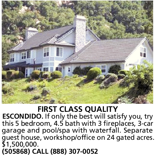 FIRST CLASS QUALITY ESCONDIDO. If only the best will satisfy you, try this 5 bedroom, 4.5 bath with 3 fireplaces, 3-car garage and pool/spa with waterfall. Separate guest house, workshop/office on 24 gated acres. $1,500,000. (505868) CALL (888) 307-0052