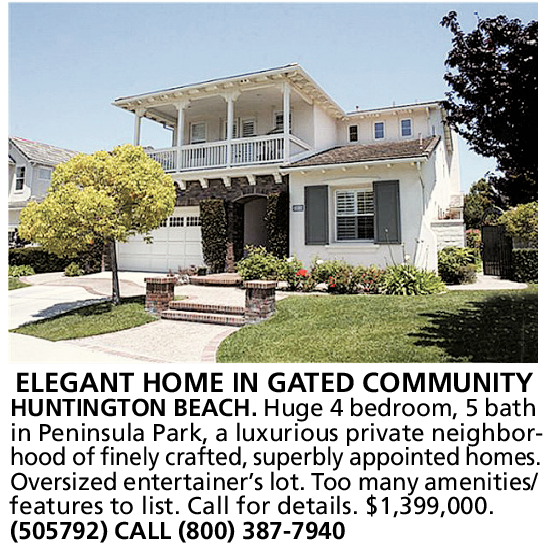 ELEGANT HOME IN GATED COMMUNITY HUNTINGTON BEACH. Huge 4 bedroom, 5 bath in Peninsula Park, a luxurious private neighborhood of finely crafted, superbly appointed homes. Oversized entertainer’s lot. Too many amenities/ features to list. Call for details. $1,399,000. (505792) CALL (800) 387-7940