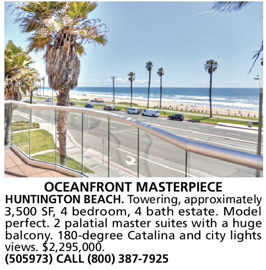 OCEANFRONT MASTERPIECE HUNTINGTON BEACH. Towering, approximately 3,500 SF, 4 bedroom, 4 bath estate. Model perfect. 2 palatial master suites with a huge balcony. 180-degree Catalina and city lights views. $2,295,000. (505973) CALL (800) 387-7925