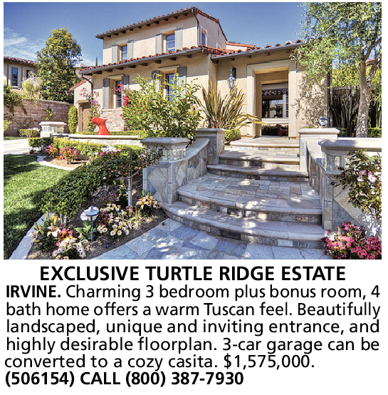 EXCLUSIVE TURTLE RIDGE ESTATE IRVINE. Charming 3 bedroom plus bonus room, 4 bath home offers a warm Tuscan feel. Beautifully landscaped, unique and inviting entrance, and highly desirable floorplan. 3-car garage can be converted to a cozy casita. $1,575,000. (506154) CALL (800) 387-7930