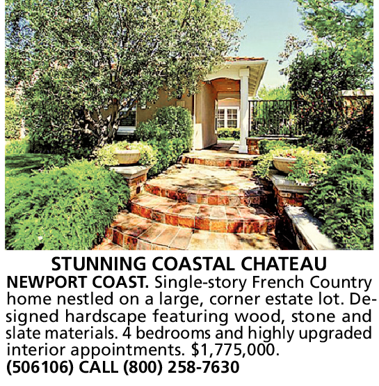 STUNNING COASTAL CHATEAU NEWPORT COAST. Single-story French Country home nestled on a large, corner estate lot. Designed hardscape featuring wood, stone and slate materials. 4 bedrooms and highly upgraded interior appointments. $1,775,000. (506106) CALL (800) 258-7630