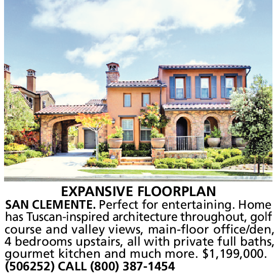 EXPANSIVE FLOORPLAN SAN CLEMENTE. Perfect for entertaining. Home has Tuscan-inspired architecture throughout, golf course and valley views, main-floor office/den, 4 bedrooms upstairs, all with private full baths, gourmet kitchen and much more. $1,199,000.