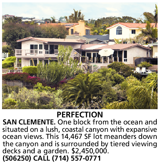 PERFECTION SAN CLEMENTE. One block from the ocean and situated on a lush, coastal canyon with expansive ocean views. This 14,467 SF lot meanders down the canyon and is surrounded by tiered viewing decks and a garden. $2,450,000.
